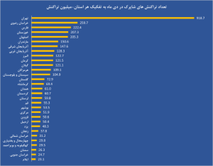 کمترین تراکنش ها به استانهای ایلامبا 23،1 میلیون تراکنش، خراسان جنوبی با 24،7 میلیون تراکنش، سمنان با 26،3 میلیون تراکنش و کهگیلویه و بویراحمد با 29،5 میلیون تراکنش تخصیص یافت.