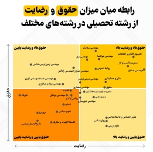 بهاینترتیب میتوان گفت رشته کامپیوتر و فناوری اطلاعات بر اساس شاخصهای درآمدی در ناحیه حقوق بالا و رضایت بالا قرار دارد.