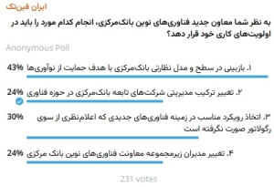 پس از تغییر معاون فناوری‌های نوین بانک مرکزی که در پی آن پس از 5 سال مهران محرمیان جای خود را به نوش‌آفرین مؤمن‌واقفی داد، ایران فین‌تک از فعالان و کارشناسان اکوسیستم فناوری و نوآوری بانکی دعوت کرد با مشارکت در نظرسنجی‌های منتشر شده در کانال تلگرامی و لینکدین این رسانه آنچه به باورشان باید در اولویت‌های بررسی و اقدام معاون جدید فناوری‌های نوین بانک مرکزی باشد، اعلام کنند.