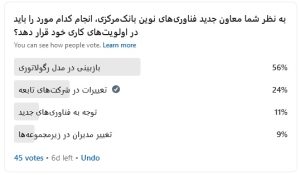 تغییر مدیران زیرمجموعه معاونت فناوری‌های نوین بانک مرکزی چهارمین و آخرین اولویت موردنظر مشارکت‌کنندگان بود که کمترین رأی را به خود اختصاص داد.